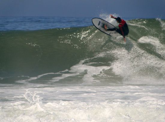 surfen bedeutet aber auch angst und respekt. um sich durch die angst zu arbeiten, muss man absolut präsent sein, eine verbindung herstellen zwischen dem, was wir fürchten und dem, was wirklichkeit ist, atemzug für atemzug. wir verbringen unsere ersten neun monate damit, im fruchtwasser zu schwimmen, demnach haben wir alle schon ein urvertrauen zum wasser. wir bringen natürlich auch die angeborene angst mit, gefressen zu werden, aber das ist eine angst aus der vergangenheit. indem man sich seiner angst stellt, der echten oder der eingebildeten, wächst unsere verbindung zum meer. diese mentale angst zu überwinden ist aber nicht immer so einfach. nach meinem unfall in jbay war ich für einige tage blockiert und hab kaum noch eine richtige welle gekriegt…