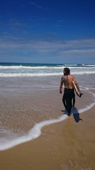 die enge verbundenheit zum meer wurde mir von meinen eltern nicht in die wiege gelegt, als schweizer generell schwierig, da kein meer. ganze 16 jahre dauerte es, bis ich das erste mal im ozean stand. aber es war die bekannte liebe auf den ersten blick oder ersten touch. seit dem begrüsse und verabschiede ich mich immer vom meer, wenn meine ferien/abenteuer beginnen resp. enden. meine tattoos verinnerlichen meine tiefe verbundenheit zusätzlich! im meer zu sein, mich treiben zu lassen, gab mir ein unglaubliches gefühl von ausdehnung und zugehörigkeit. nach einer weile gab es kein „ich“ mehr, sondern nur noch das meer, das sich durch unsere augen selbst anschaute. aber auch wir, die backpacker & surfers, entdecker unserer zeit, wir, die mit dem ozean einen lebenslangen pakt eingegangen sind, erfahren die purste form von glück und erfüllung in verbindung mit dem meer. gibt es was schöneres, wenn die meeres brise sanft um die nase streicht, das rauschen der wellen dich in einen meditativen zustand versetzt und das starren an das ende des horizontes dir ein gefühl der zufriedenheit verleitet?