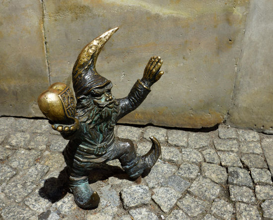 Genau hinschauen - man entdeckt an die 250 Zwerge aus Bronze in Breslau. Dieser Tick für die kleinen Figuren hat in den 80er Jahren aus einer Protestaktion begonnen. Diverse Künstler und Studenten der Kunsthochschule gestalten diese niedlichen Kerle.