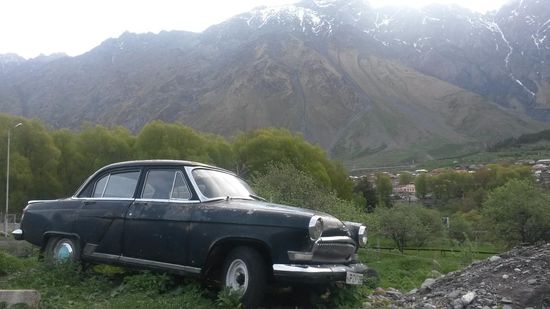 Um 06:30 Uhr waren wir am Kasbek, der wirklich von keiner Wolke verhangen war. In Sichtweite des Kasbeks befindet sich auf einem kleineren vorgelagerten Berg eine berühmte Kirche (bin grad zu faul nachzugucken), die es auch auf die Front meines Reiseführers geschafft hat (wie immer zu empfehlen: Trescher Verlag, Georgien). Nachdem unser Freund Irakli einen Eingeborenen wachgeklingelt hatte, saßen wir kurze Zeit später noch in einem zum Geländewagen gepimpten Isuzu und rumpelten für knapp 20 EUR (50 Lari) den Weg zur Kirche hoch. So wie die anschließende Buckelpiste auf Dauer das Fahrzeug verschleißen muss, waren 20 EUR sicher nicht zuviel. Solche Geländewagen stehen im ganzen Dorf herum und sind jeweils deutlich besser in Schuss als das Haus vor dem sie stehen. Ja, auch von der Kirche nochmal ein schöner Blick.