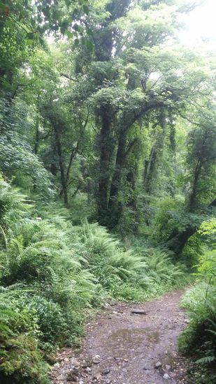 Nicole entdeckte im Visitor Center eine kleine Wanderung zu einem sehr schönen Wasserfall. Dem St. Nectans Glen. Der Weg dort hin führte uns zuerst über Kuhweiden und Kartoffelfelder bis wir in den Wald kamen. Wir liefen immer, auf gut ausgebauten Wegen am Bach entlang, tiefer in den Wald hinein.