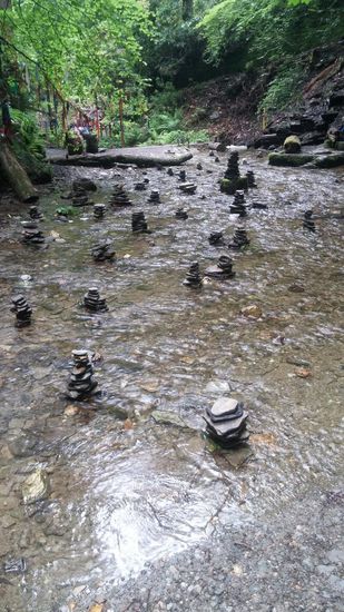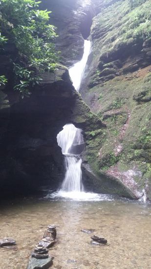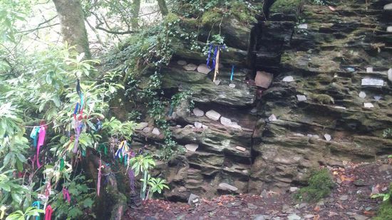 Nach ca. einer Meile durften wir mal wieder unser Portemonnaie öffnen. 5 Pfund pro Person! Die sind wahnsinnig! Bezahlt haben wir in einem kleinen Häuschen das mit Feen und ähnlichem Zeug vollgestopft war. Wir sollten noch herausfinden warum das so ist. Ein paar rutschige Stufen später erreichten wir den Wasserfall. Das ganze Areal machte einen etwas surrealen Eindruck auf uns. Überall bunte Schleifen in den Bäumen und Büschen, im Wasser kleine Steinpyramiden, in den Wänden standen flache Steine mit eingeritzten Namen und Leute die am meditieren waren.