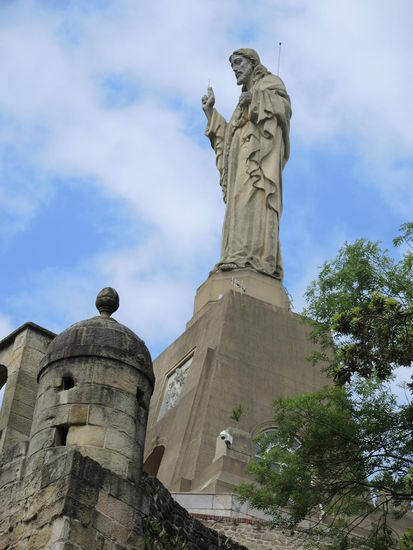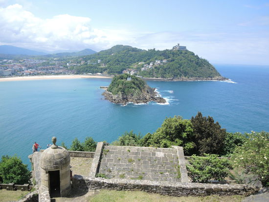 Bei unserem Streifzug entdecken wir den Aufstieg zum Monte Urgull mit seiner Festungsanlage und der Christusstatue. Zwar kommen wir jetzt sogar ein wenig ins Schwitzen, aber der Abstecher lohnt sich. Von hier oben aus hat man einen wundervollen Blick auf die Bucht, die Stadt und die dahinter liegenden Berge. Es hat tatsächlich ein bisschen was von Copacabana und Zuckerhut
