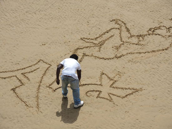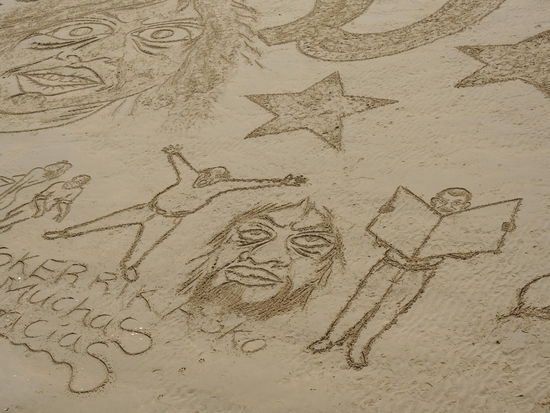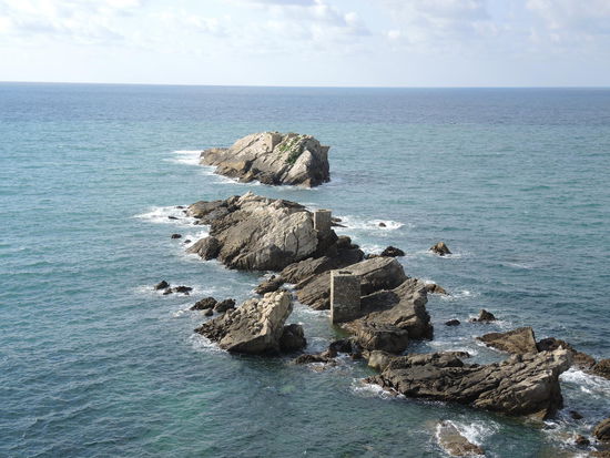 Am späten Nachmittag machen wir uns schließlich auf den Rückweg. Am Strand können wir an der Promenade noch einem "Sandmaler" zuschauen, wie er mit einem Stock vergängliche Bilder in den Sand zeichnet. Insgesamt ein perfekter Tag, an dem uns - trotz Dauerregen-Prognose der Wetter-App - sogar die Sonne hold ist. Nach einer Siesta auf dem Campingplatz machen wir noch eine Abendrunde mit unserem Hund hinunter zu einer ehemaligen Erzmine am Meer unterhalb des Campingplatzes. Hier gab es wohl in vergangenen Zeiten einen Verladekran, mit dem das geförderte Erz über eine Seilbahn auf Schiffe verladen wurde. Ein wichtiger Rohstoff zu Zeiten, als das Baskenland in seiner wirtschaftlichen Blütezeit der Industrialisierung stand.