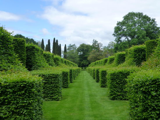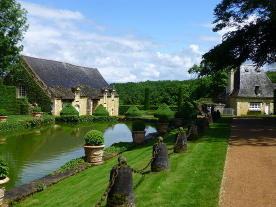 So gelangen wir zu den Jardins de Manoir d'Eyrignac. Hier erwartet uns ein echtes Schmuckstück. Der private Park gilt als einer der schönsten Gärten Frankreichs und ist ein Musterbeispiel für die Formschnittgärtnerei. Er braucht den Vergleich mit den Schlossgärten an der Loire wahrlich nicht zu scheuen und wir sind begeistert. Wir schlendern durch Heckenlabyrinthe, formvollendet geschnittene Alleen, Buchsbaum-Skulpturen und tauchen ein in sattes Grün. Einen Regenschauer überstehen wir unter dem Blätterdach, nur eine Kaffeepause ist uns nicht vergönnt. Das Restaurant ist brechend voll.