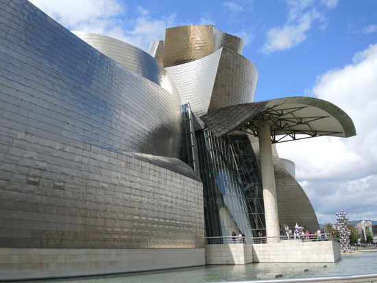 Das Guggenheim-Museum Bilbao ist ein Kunstmuseum für Moderne Kunst in Bilbao im spanischen Baskenland. Es hat eine Ausstellungsfläche von 11.000 m² und zeigt sowohl eine Dauerausstellung als auch externe Wanderausstellungen. Das Museum ist eines von sieben Guggenheim-Museen der US-amerikanischen Stiftung Solomon R. Guggenheim Foundation....... Das einem Oval ähnliche Gebäude befindet sich in der Innenstadt Bilbaos am Ufer des Flusses Nervión, welcher in die Ria de Bilbao mündet. Architekt ist der kanadisch-US-amerikanische Architekt und Designer Frank O. Gehry. Das Baukonzept wurde 1993 der Solomon R. Guggenheim Foundation vorgestellt. Die Grundsteinlegung erfolgte noch im gleichen Jahr.[1] Das Gebäude wurde 1997 fertiggestellt und ist für seinen dekonstruktivistischen Baustil berühmt. Die Bauzeit betrug vier Jahre. Das Gebäude wurde sowohl in der geplanten Bauzeit als auch im Budgetrahmen errichtet. Das Konstrukt wurde zuvor mit der CAD-Software CATIA berechnet. Das Guggenheim-Museum ist eine der bedeutendsten Sehenswürdigkeiten der Stadt. 2001 erhielt es den „Outstanding Structure Award“ der IABSE. Von dem Museumsbauwerk und seinem Einfluss auf die Stadt abgeleitet ist der Begriff Bilbao-Effekt.[/k]