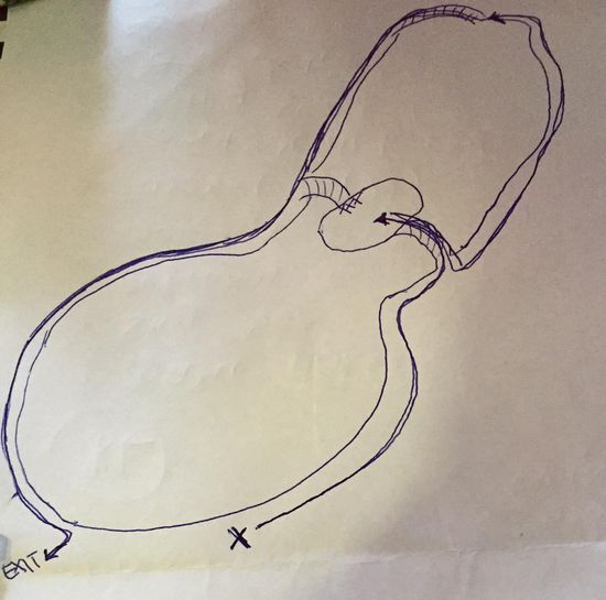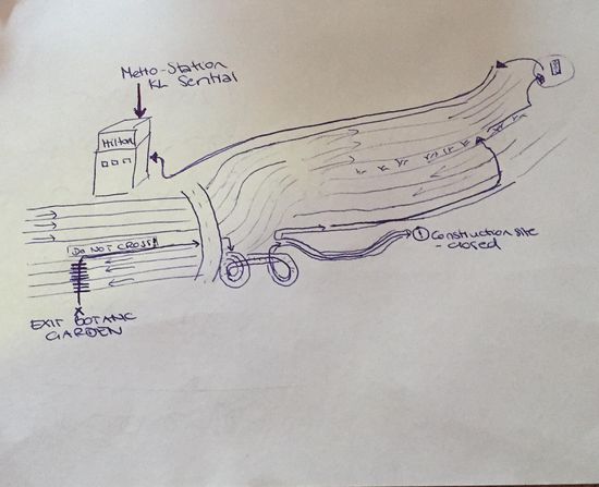 Danach wollte ich nicht gleich zum nahegelegenen Exit des Parks. In Sichtweite war eine Brücke über das Gewässer... Die war jedoch gesperrt. Zurück oder dann noch ein Stückchen weiter? Ach... Ist ja schön hier... Nach hinten raus ging der angelegte See größer weiter als gedacht, so dass die Runde um den See letztlich Ca 4 Kilometer lang wurde. Egal, denn gleich hinter dem Exit sah ich das Hiltonhotel. Und gleich dahinter sollte sich meine Metrostation befinden. Leider war der direkt Fußweg über die Straße zum Hilton gesperrt. Ich wollte also auf die nächste Brücke, überquerte diese, stieg auf der Rückseite eine Treppe hinauf, um oben festzustellen, dass diese mich nicht auf die Treppe, sondern auf eine weitere andere Straßenseite führte... Als ob es dann auf den Umweg noch ankommt. Auf der anderen Seite wollte ich nicht den schmalen Fußweg an der vierspurigen Straße nehmen sondern bog einen anderen -scheinbar Parallel- Weg ein... Der in einer Baustellenausfahrt mündete... Also wieder zurück. Ich habe mal versucht, euch das grafisch darzustellen. Ich will gar nicht im Detail berechnen, wieviel Fußweg sich alleine durch Umwege ergeben hat, aber an dem Tag bin ich sicher 25 Kilometer zu Fuß gegangen...
