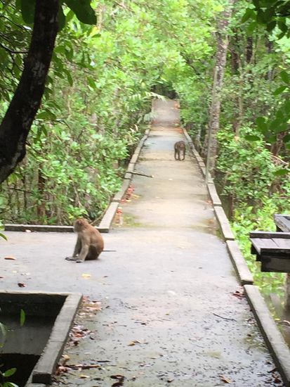 Bereits Ca auf der Hälfte saßen Affen mitten im Weg. Und nichtmal kleine. Nun habe ich wirklich keine Angst vor Affen, aber gerade in einer Situation wo sie deutlich in der Überzahl sind, ich von Stechmücken abgelenkt werde und wirklich nicht mit Sack und Pack in den Sumpf fallen möchte, habe ich zuminsest eine gehörige Portion Respekt.