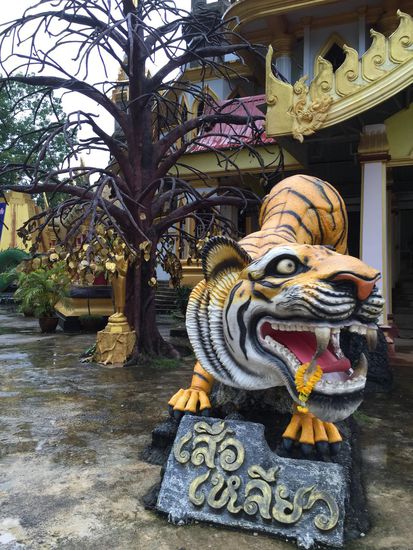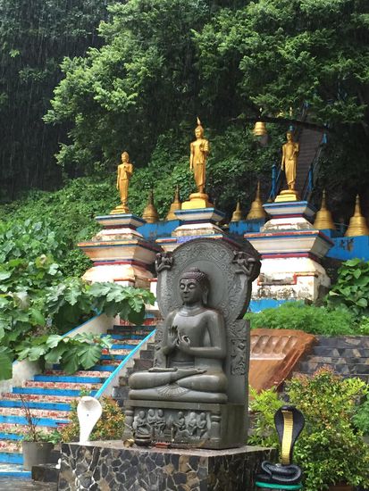 Es erwartete mich ein völlig kitschiger buddhistischer Tempel um den Viele Hunde Katzen und Affen Streunern.