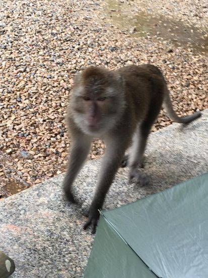 Leider fing es mal wieder an zu regnen und ich setzte mich unter. Wartend beobachtete ich das Morgendliche Treiben der Affen, die versuchten, an Essensreste zu kommen, spielten und anderweitig versuchten an Nahrung zu kommen. Ich hatte schon gelesen, dass die Affen hier sehr dreist seien und man gut auf seine Sachen achten sollte.