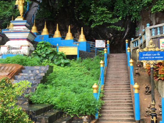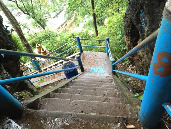 Da es auch mit vieeeel Geduld nicht aufhören wollte zu regnen ( top, denn Regenjacke lag im Hotel), ergab ich mich meinem Schicksal und machte mich an den Aufstieg. Anfangs dachte Ich noch, dass das blattwerk der umgebenden Bäume eh als natürliches Dach fungieren würde... Bei Stufe 233 war ich vom Gegenteil überzeugt und stelle mich unter einem Felsvorsprung unter. Es könnte ja nicht ewig regnen.