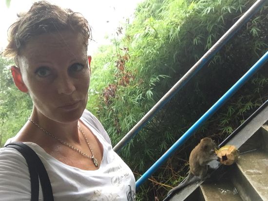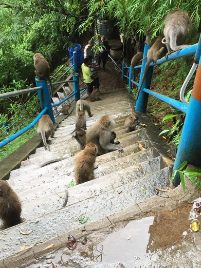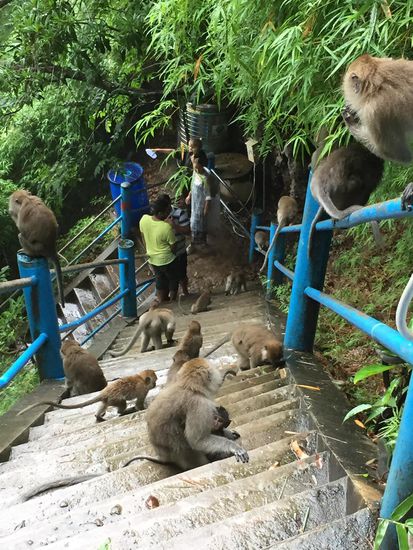 Ich zählte jede einzelne Stufe und rechnete immer mit: "ein Fünftel geschafft"... "Diese Strecke noch dreimal"... Der Einfachheit halber mit 1000 Stufen. Außer Acht lassend dass es eigentlich 25 % mehr waren... Aber wenn ich erstmal vierstellig war , würde der Rest ja easy. Wenn ich über irgend etwas stolperte was dachähnlich war, stellte ich mich unter. Weniger um nicht nass zu werden, denn mittlerweile war ich ziemlich durchnässt (was aber gar nicht so schlecht war, weil man zwischen Schweiß und Regen nicht mehr unterscheiden konnte), sondern um einfach mal wieder den Herzschlag und die Atmung auf Normalniveau zu bekommen. An einem dieser Stopps überholten mich tatsächlich drei Inder und zwei Deutsche. Egal... Ich war entspannt. Hab ja Zeit. Lustigerweise habe ich mich irgendwann wieder an den Anstieg gemacht und die deutschen überholt, als sie auf den Treppen sitzend pausierten. Auf die Inder traf ich an einer Ecke wo sie sagten, dass um besagte Ecke unglaublich viele Affen kämen. Das war Ca bei 800 Stufen. Also heute würde ich mich von keinem Affen aufhalten lassen! Und jetzt schonmal gar nicht mehr.