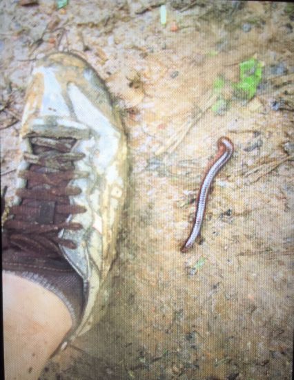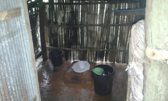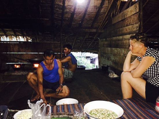 Dann geht es los. Vorbei an den Tarantulalöchern, die Sebi jetzt schon so gut mit einem Stock befühlen kann, dass eine Spinne aufgeregt zur Verteidigung angerannt kommt. Ich bin froh, dass ich den Stock von gestern noch habe. Bei jedem Schritt denke ich, dass es mich hinhaut. Die Steigung ist immens und es gibt fast nur ausgetretene Stellen durch die das Wasser den Berg hinabläuft. Wo soll man da halbwegs trittsicher seinen Fuß hinsetzen? Zwischendurch wird mir eine helfende Hand von anderen guides entgegen gestreckt. Mal wieder kommt mir der Gedanke... Was ist wenn ich einfach nicht weitergehe? Oder jemand besteche der mich mit dem Motorrad heimbringt? Goo ist mein Retter in der Not. Circa die letzte Hälfte des Weges nimmt er mich an die Hand und rettet mich so mindestens 6 mal davor mich der Länge nach hinzulegen und auf dem Bauch den Berg herunterzurutschen. Außerdem zeigt er mir wo genau ich meinen Fuß hinsetzen soll - im Zweifel neben seinen, der mir Halt gibt. Ich komme mir vor wie eine 90jährige Oma die über die Straße geleitet wird. Es ist unklar ob das Regen- oder Schweißtropfen sind, die von meiner Nase Tropfen. Wie ein kleines Kind frage ich alle 30 Meter: wie weit noch?. Irgendwann als ich es gar nicht mehr für möglich halte, sagt Goo, dass wir jetzt den Berg geschafft hätten und am Fluss seien.