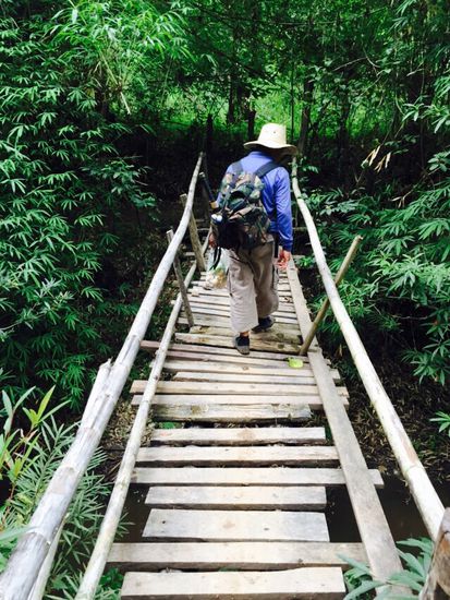 Immerhin waren wir jetzt auf einem Hügelchen. Also erstmal nur geradeaus. Und dann ging es wieder bergab. Verdammt! Runter war es bei diesen Bodenverhältnissen fast noch anstrengender. Ich wollte nicht schon wieder zurückfallen, musste aber bei jedem Schritt aufpassen, dass es mich nicht hinhaut. Wer will sich schon im Nationalpark in Nordthailand den Knöchel brechen? Gibt es hier flying doctors?
