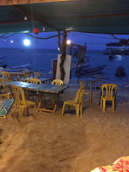 Wäre ja ganz schön gewesen wenn wir halbwegs vorbereitet gewesen wären, aber wer kann sowas denn ahnen. Da saßen wir also, mit Gänsehaut überzogen und wollten statt unseren kalten Fruchtsäften am liebsten heißen Tee trinken. Da wir ja außerdem mit dem Taxiboot zurückfahren wollten, hatten wir keine Lampe dabei. Würden bei diesem Wetter aber keine Boote fahren ... Wie würden wir durch den Urwald ohne Lampe finden? Der Weg hin zu Coral Bay war abenteuerlich genug. Und so schwebten viele Fragezeichen über unserem Tisch, während wir außerdem feststellten, dass das Barbecue hier nicht so grandios war, wie in unserer Bucht. Hatten wir eigentlich das Seitenfenster in unserer Hütte zu gemacht? Könnte es da reinregnen? Würde es überhaupt irgendwo reinregnen? Wenn unsere Sachen nass würden... Wie bekämen wir sie bis zur morgigen Abreise trocken? Es gibt doch immer nur kurze Schauer. Warum regnet das jetzt schon eine Stunde und wird nicht weniger?