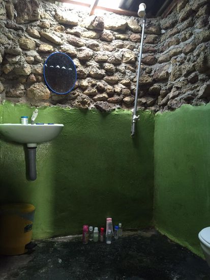 Am Abend haben wir die Dusche eingeweiht, die natürlich nicht beheizt ist. Man kann kann also abends kalt oder mittags (wenn die Wassertanks aufgeheizt sind) brennende heiß duschen. Diese Optionen gibt es beim Strom nicht: den gibt es nur von 19.30 bis 6.30. Da es keine Klimaanlage gibt, heißt das, dass man zumindest in der Zeit mit Ventilator schlafen kann. Da über dem Bett bereits ein Moskitonetz hing, haben wir meins für entspannte Abende mit Blick auf die Bucht und den Sternenhimmel auf der Terrasse gespannt. So sah unsere Bleibe übrigens aus: