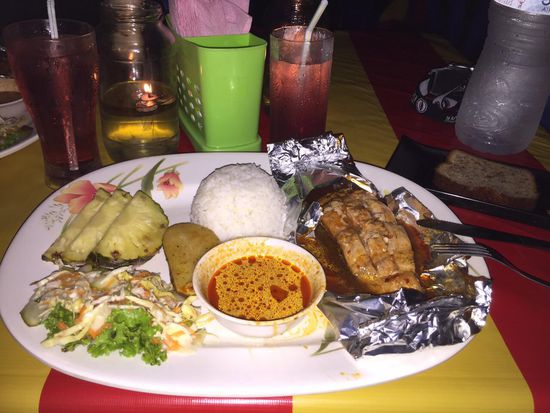Wie künftig jeden Abend haben wir am Strand, mit den Füßen im Sand, fangfrischen Fisch gegessen. Inkl. Vorspeise (Bananenkuchen), Beilage ( nach Wahl), Nachtisch (Obst) und Getränk für den Preis von 5€.