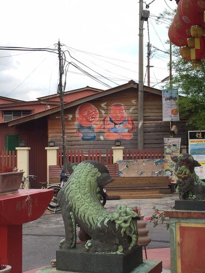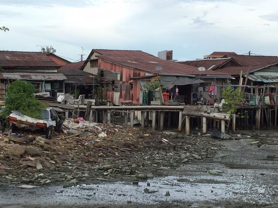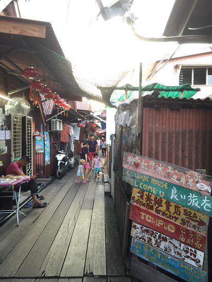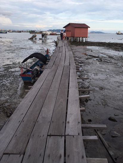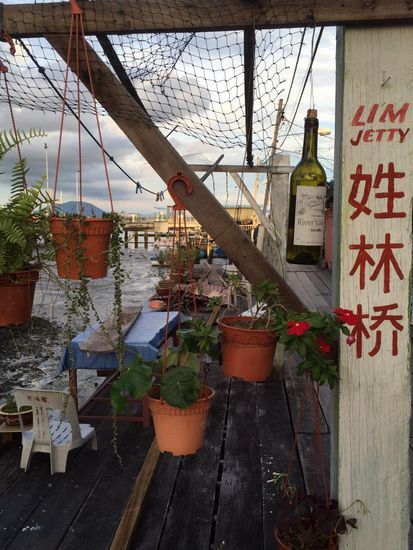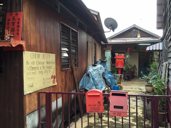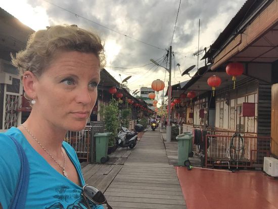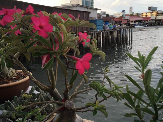 Am Abend, trotz erster Müdigkeitserscheinungen, habe ich mich noch zu den Jettys begeben. Normalerweise im Land die Bezeichnung für Bootsanlegestege, haben die Jettys hier eine besondere Bedeutung. Denn als damals die Chinesen nach Georgetown kamen, konnten viele sich die Mieten nicht leisten, um in der Stadt zu leben. Einer hats vorgemacht und viele nach: da wurden auf mit Zement befüllten alten Eimern, die als Stelzen dienten, Stege ins Meer gebaut, auf denen sich die verschiedennamigen Familien ansiedelten. So gab und gibt es zum Beispiel eine Choo Jetty. Kamen weitere Personen mit dem Nachnamen Chew an, würden sie ebenfalls dort aufgenommen und angesiedelt.