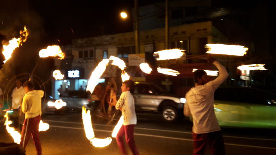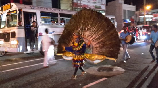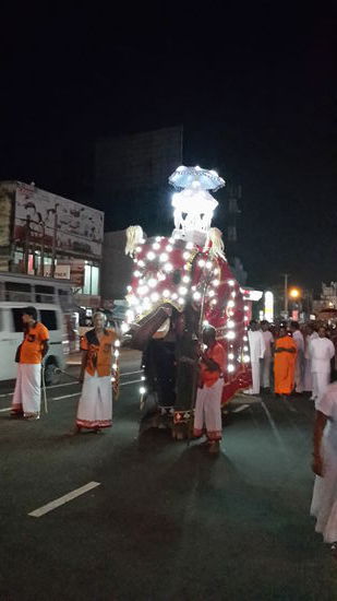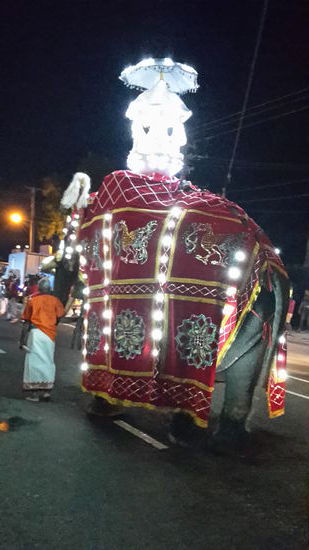 Zunächst sieht man Darbietungen von Fackelträgern, Feuertänzern, Akrobaten, Musikern und Tanzgruppen in verschiedenen Kostümen. Das absolute Highlight war der prunkvoll dekorierte mit hellen Glühbirnen geschmückte Tempel-Elefant.