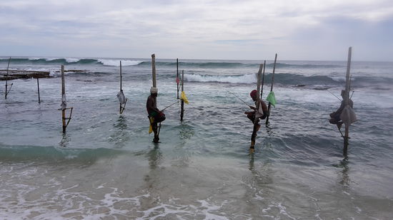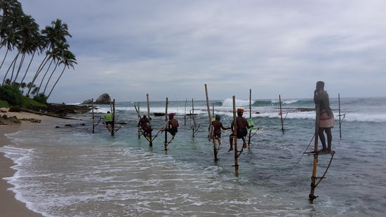 Die Südküste Sri Lankas ist berühmt wegen der Stelzenfischer. Zwischen Koggala und Weligama, auf knapp 30 Kilometer, ragen in den Buchten die hölzernen Stelzen aus dem Wasser, die "ritipane".
