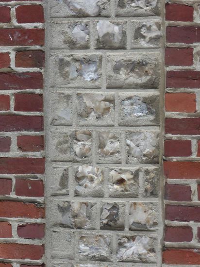 Kombination aus Backstein mit eingeschlossenen Feldern aus Flintstone - meist sogar mehrfarbig - ist die typische Bauweise der Gegend