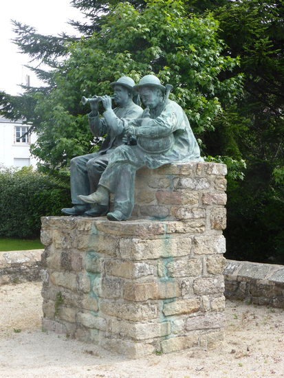 Neben der Kirche steht ein Denkmal für die sonneurs bigoudien, wie sie in der Bretagne verbeitet sind/waren. Sie spielen einen Dudelsack und eine Bombarde - ein Doppelrohrblattinstrument, das von der Schalmei abstammt.