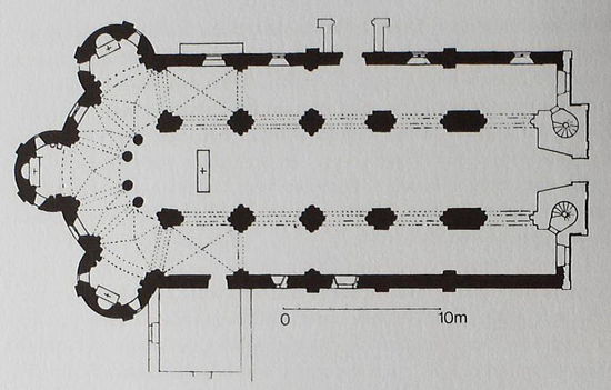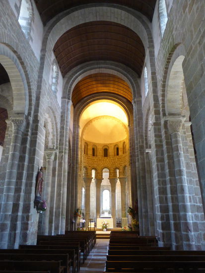 Die Säulen des halbrunden Chorabschlusses sind durch gestelzte Bögen miteinander verbunden. Steingewölbe gibt es nur über dem Chor, dem Chorumgang (Kreuzgewölbe) und den Kapellen, sonst tragen die Unterzüge Holzverschalungen in Form von Vierteltonnen wie in den Seitenschiffen oder erwecken wie im Hauptschiff den Eindruck eines Tonnengewölbes. Durch die Fenster oberhalb der Arkaden fällt Licht in das Kircheninnere. Besonders beachtenswert sind die schönen Kapitelle mit Blumendekor und geometrischen Mustern der vier zylindrischen Chorsäulen