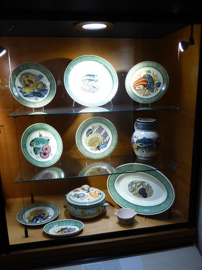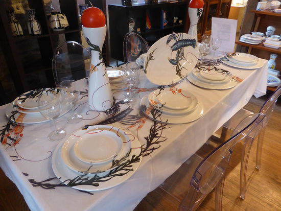 Im anschließenden Verkaufsraum entdecken wir einem traumhaft gedeckten Tisch – entworfen von einer Künstlerin, die neben den Tellern auch die Tischdecke in die fortlaufenden Motive einbezogen hat. (Hummermotiv)