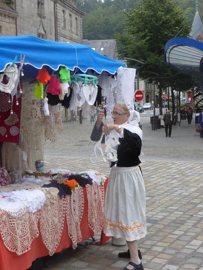 Auf dem Platz vor der Kathedrale verkauft eine ältere Dame Stickereien. Hier haben wir die Gelegenheit einmal die hohe bretonische Kopfbedeckung in natura zu bewundern.