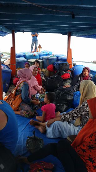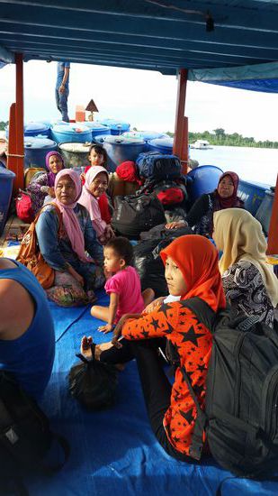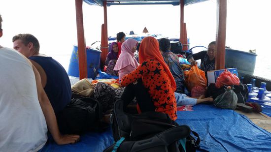 Die Überfahrt ist recht ruhig, wir sitzen auf dem Boden die Einheimischen liegen und schlafen. Sie haben 2 kleine Kinder dabei. Eins davon wurde zwischendurch gepampert und—na--: zack wurde die gebrauchte Pampers ins Meer geworfen! Wir alle schauen dem schwimmenden Plastikklumpen eine Weile fassungslos nach.