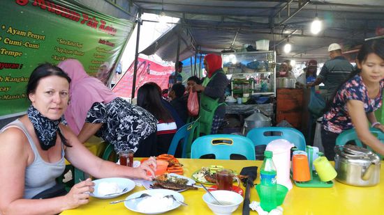 Die Straße ist vollgestopft und man ist zu Fuß schneller als mit dem Auto, auf den Fußwegen sind überall Essensstände...mmmhhh..