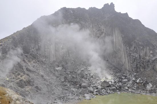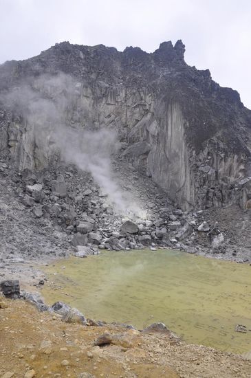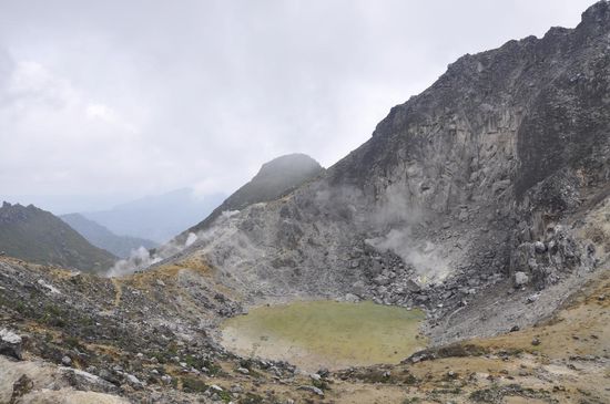 Wir marschieren weiter bis zum Kraterrand und schauen hinunter auf den gelb-grünen Kratersee.