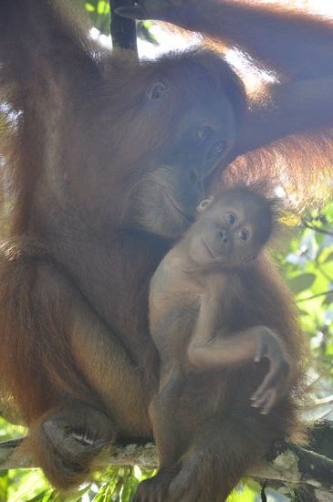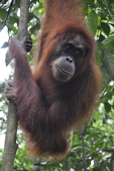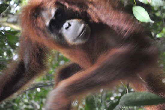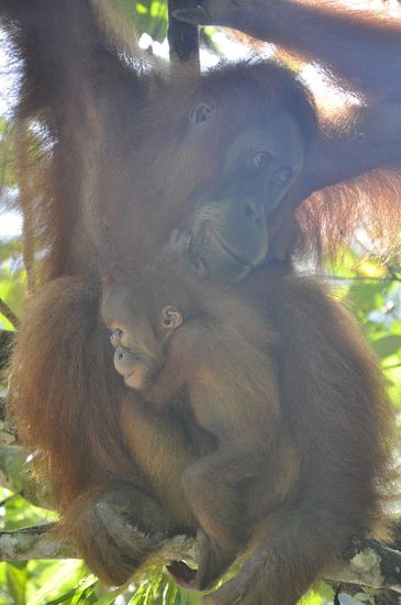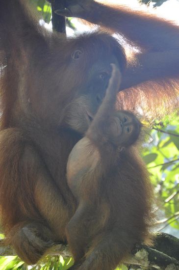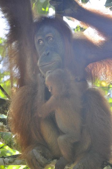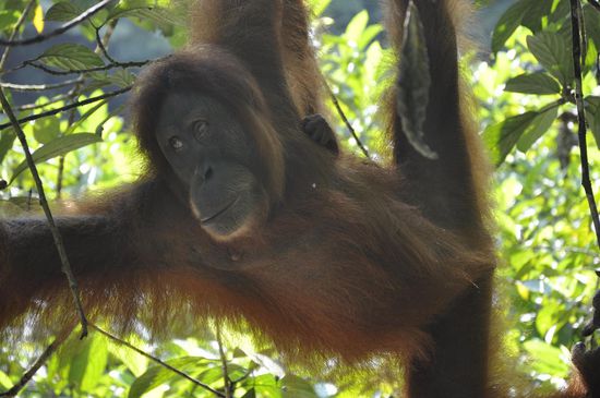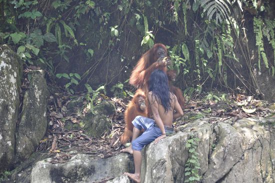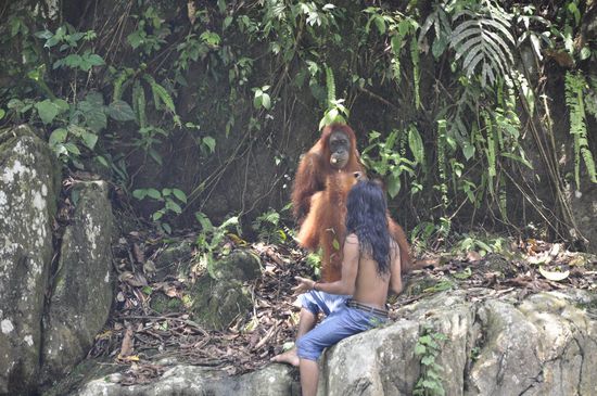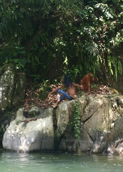 Nach der gemeinsamen Waschzeremonie am Fluß , sehen wir am anderen Ufer "Jacky"--das ist die riesige zutrauliche Orang Utan Dame von der uns die Guides auch schon erzählt haben.