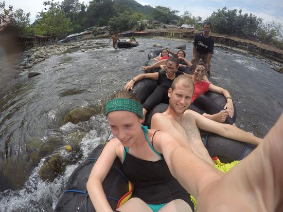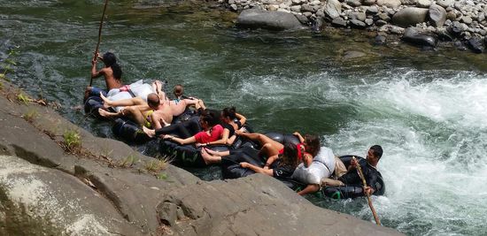 Die Jungs wagen waghalsige Sprünge von den Felsen ins Wasser--dann gibts noch Lunch und ab gehts auf die Tubes--dann heimwärts gehts per Rafting.