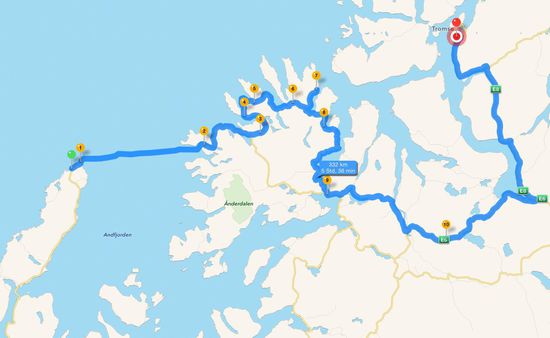 Freitagmorgen (ist es wirklich Freitag??) und ich sitze in einem Hotel in Tromso. Tja... erstens kommt es anders und zweitens als man denkt. Eigentlich wollte ich gestern ja eine Wal-Safari in Andenes unternehmen. Also bin ich nach dieser stürmischen Nacht im Regen nach Andenes ins Walbüro gefahren und habe die nette Dame gefragt, wann die nächste Safari stattfindet. Leider gab sie mir den negativen Bescheid, dass heute (also gestern) aufgrund des Sturms keine Safari stattfindet und die nächste, am Freitagmorgen um 11.00 Uhr bereits voll ist. Den nächsten freien Platz, falls die Safari dann am nächsten Tag überhaupt stattfinden kann, wäre somit jener um 12.00 Uhr gewesen. Da man mit einer Dauer von ca. 5 Stunden rechnen muss und die letzte Fähre bereits um 17.00 Uhr Andenes verlässt, hätte ich noch mindestens 2 mal in Andenes übernachten müssen. Da ich aber doch noch einiges auf meiner Reise sehen wollte (u.a. das Nordkapp ), habe ich schweren Herzens die Safari auf einen späteren Zeitpunkt verschoben.
