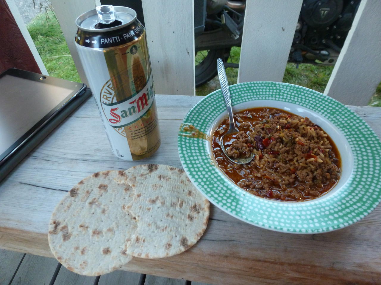 Nachdem es in Norwegen keine einzige Mücke gewagt hat, in meine Nähe zu kommen, haben sich diese hier in Finnland direkt nach meiner Ankunft auf mich gestürzt. Aber dafür gibt es ja Antibrumm und vor allem ein Stümpchen. Ich bin auf einem Campingplatz und habe mir vorhin Lebensmittel gekauft und dann damit Chilli con carne gekocht. Wuuuunderbar. Für etwa 4 Personen. Ein kleiner Rest ist jetzt noch übrig .