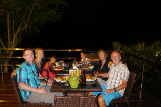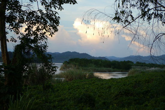 Am Nachmittag kommen wir an unserem nächsten Etappenziel an, dem "Mekong Riverside Resort & Camping" in der Nähe von Pak Chom. Zwei Doppelbungalows stehen unter Bäumen mit Sicht auf den Mekong. Die Anlage besticht durch die vielen Fruchtbäume, die netten Besitzer Ben und Mike und die wunderschöne Lage in einer Kurve des Mekong. Es ist herrlich ruhig hier, die Strasse, die hinter der Anlage verläuft, ist wenig befahren. Die zwei Hunde freunden sich schnell mit unseren Kindern an. Oder ist es eher umgekehrt? Wir beziehen ein Doppelbungalow, meine Eltern und Luisa in einem, im anderen Tobias, ich und Ruven. Das Abendessen, das Ben uns kocht (Massamam-Curry) ist sehr lecker und die Stimmung locker und fröhlich. Ben und Mike setzen sich zu uns, wir plaudern zusammen und erzählen ein wenig von unserer Reise. Auf der Terrasse kreucht und fleucht es von verschiedenen Tieren: Mücken, Falter, Gottesanbeter und sonstiges Getier. Die Geckos lauern an den Wänden auf fette Beute. Auf einmal entdecken wir einen Tukeh, der sich immer näher an die Lampe schleicht. Imposantes Tier!