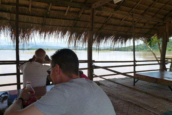 Am Mittag essen wir in einem kleinen Dorf direkt über dem Mekong auf dem Boden sitzend. Es gibt - wie könnte es anders sein - Fisch. Die Bedienung ist unfreundlich, das Essen aber sehr lecker. Nicht alle von uns können so gut am Boden sitzen, aber auch die Männer meistern diese Hürde gut. Ein wenig später setzt sich eine Gruppe Grenzbeamter in die Nähe. Sie rufen unsere Männer zu sich, auch Ruven und Luisa gesellen sich zu ihnen. Dieser "interkulturelle" Austausch scheint ganz interessiert und freundlich zu sein. Es wird auf beiden Seiten viel gelacht, auch um über die Sprachbarrieren hinweg zu kommen. Am Schluss darf ich dann von allen eine Foto machen.