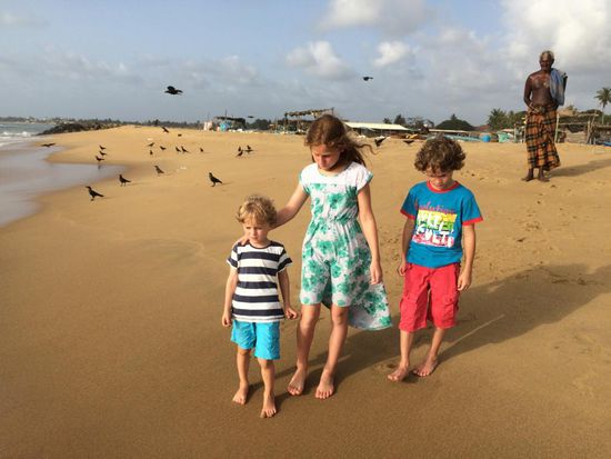 Auch wenn die Kinder schon längst wach sind, drehen wir uns gern noch 4-5x um. Der Jetlag ist noch nicht ganz überwunden oder es ist eben doch schon der Urlaubsmodus eingestellt... ;o) Um 9Uhr sitzen wir beim Frühstück mit frischem Obst, Omlette, Juice und Tee und genießen die Atmosphäre. Die Kinder flitzen schon nach kurzer Zeit sich umziehen und sind die nächsten 2-3h im Pool. Wir widmen uns dem Planen der nächsten Tage und organisieren die Weiterfahrt gen nördlichem Landesinneren. Am Nachmittag haben wir erneut Bedarf an frischem Fruit Shake und so setzt uns das Tuk Tuk beim bewährten 'Sweet Bombay' in der City ab. Leckere Chicken Samosa gibt es natürliche auch wieder und das nette Personal macht Selfies mit Matteo. Danach kurzer Stop an der Kirche und durch sehr ärmliche Gassen und über dreckige verwaiste Plätze zum Meer. Der Strand ist hier sehr vermüllt und eng. Kurz dahinter sehr einfache Behausungen und interessierte Gesichter...so oft verläuft sich hier wohl kein europäisches Gesicht her. Den Kindern ist dies egal, sie spielen und buddeln im Sand, wir müssen bei der aktuellen Brandung permanent ein Auge auf sie haben, besonders auf den Kürzesten! Gegen Abend geht es zurück durch enge Strassen gen Innenstadt, immer unter den neugierigen Blicken der Anwohner. Zum Abendbrot gibt es chinesisch angehauchte Küche und ab 19:30Uhr sind wir wieder im beleuchteten Pool zum Abendspaß. Wir genießen den letzten Abend hier im schicken Ambiente, natürlich mit Lion Lager Beer.