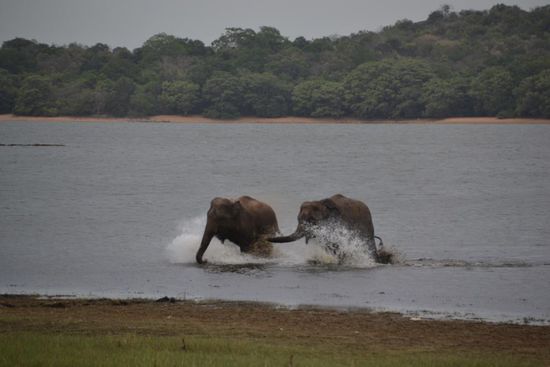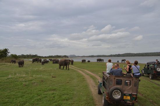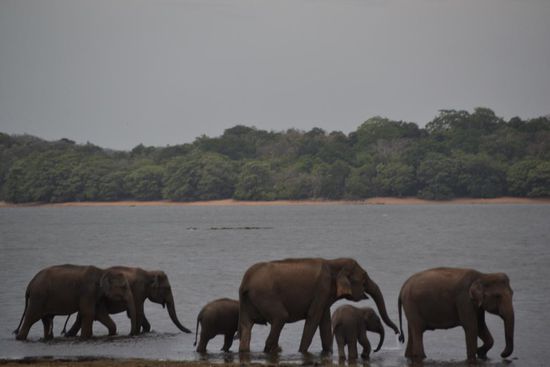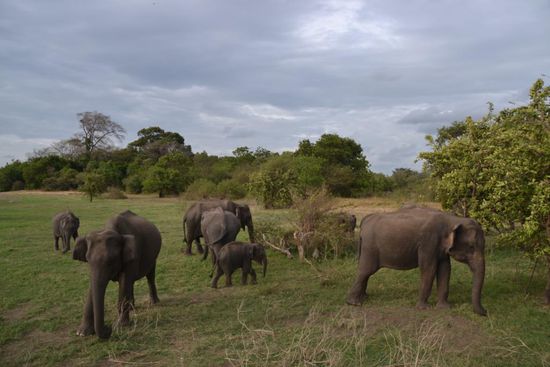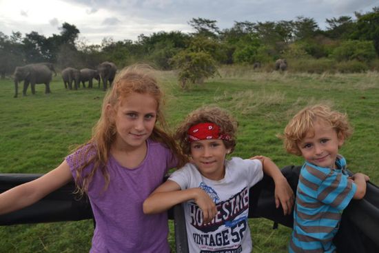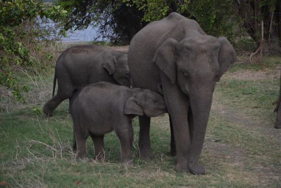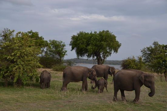 Da unser Gastgeber einen eigenen Geländejeep besitzt steht bald fest, dass wir an diesem Tag mit seinem Bruder als Fahrer in den Minneriya National Park aufbrechen werden. So verabreden wir uns für 12:30Uhr und fahren zuerst über einige Dorfstraßen durch den Dschungel nach Habarana. Hier gönnen wir uns (Anja und ich parallel) eine sehr gute und entspannende Ayurveda Massage inkl. Kräutersauna und Tea in einer ganz neu eröffneten Anlage mitten im Dschungel. Anfängliche Arztbefragung, Ölmassage und der Tradition nach wurden wir von gleichgeschlechtlichem Personal massiert, sehr komfortabel und zuvorkommend. Unser Fahrer hat derweil auf die Kids aufgepasst und sie beschäftigt, Chamäleons gezeigt,... Danach starten wir gegen 15Uhr zum Nationalparkeingang, wo preislich ordentlich zugelangt wird. Die Piste in den Park führt durch dichten Urwald, wir sichten ein Krokodil und erreichen die Ebene des Minneriya Wewa, einem im 3. Jhd. künstlich angelegten Reservoir. Hier wandelt sich die Landschaft in eine sehr offene Ebene mit weiten grünen Wiesen, welche durch den Rückgang des Sees zu dieser Jahreszeit entstehen und der Grund dafür sind, dass ein Teil der wild auf Sri Lanka lebenden Elefanten hier zusammenkommen, um ihren Hunger und Durst zu stillen. Diese benötigen täglich bis zu 250kg Gras und 100l Wasser. Im Jeep stehend geht es durch einen Fluss und dann die recht buckligen Pisten über die Ebene. Wir sehen einige Vögel wie Störche, Wasserbüffel, Pfaue, Kühe und am Ende eine Menge der wild lebenden Elefanten, welche gen Abend zwischen 16-19Uhr auftauchen. Lange beobachten wir diese aus zum Teil nur 5m Distanz. Später geht es den gleichen Weg zurück zum Parkausgang und in der Dunkelheit erreichen wir gegen 19:15Uhr wieder unsere Unterkunft, nicht ohne zuvor nach einer Vollbremsung noch einer Schildkröte von der Straße zu helfen. Lecker Abendmahl bei angenehmem Wind im Freien, die Kinder spielen den ganzen Abend mit den Gastgeber-Jungs. Vor der Tür im Gästehaus wieder Viehzeug der Grashüpferfraktion und so manch unbekanntes Wesen...