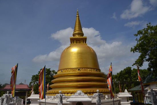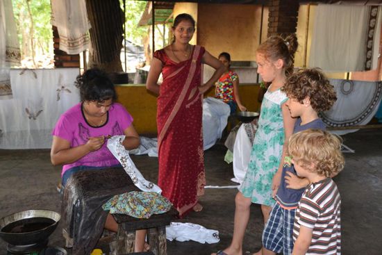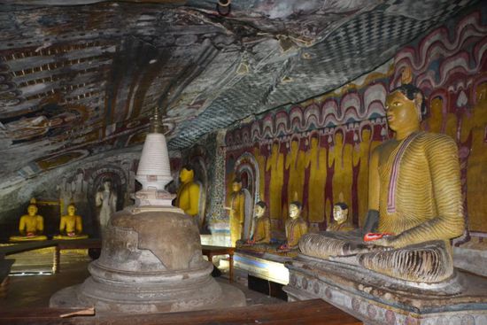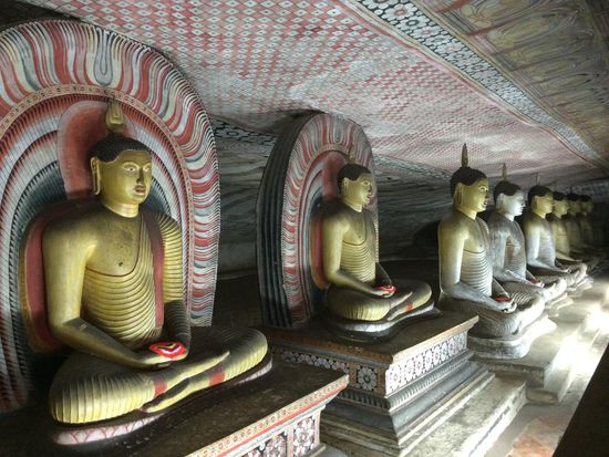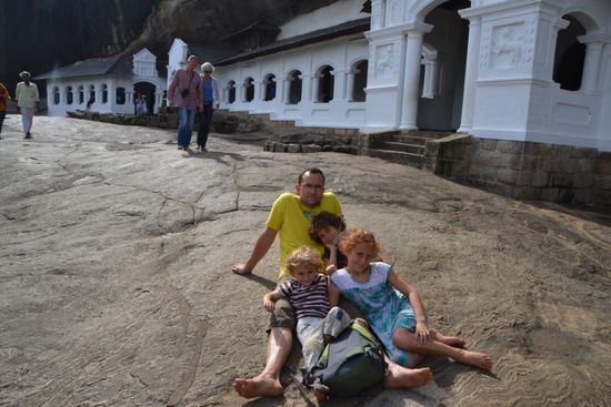 An Tag 3 in Sigiriya bringt uns der Hausherr nach dem 9Uhr Frühstück gegen 11Uhr nach Dambulla. Zuvor Besuch der Batik-Manufaktur und des Herbal-Garden. Letzterer hält sehr interessante Informationen über die traditionelle Medizin bereit, Kräuter zum Anfassen sowie Riechen und beschert uns erneut eine kleine Massage inklusive Ginger-Tea. Gegen 13:45Uhr erreichen wir den Golden Temple und machen uns auf den Weg hinauf zu den Höhlen-Tempeln, welche ca. im Jahr 100 v. Chr. entstanden, als sich der damalige König hier 14 Jahre vor den erneut von Norden einfallenden Tamilen verschanzte. Über Felsen und Treppen geht es 110m steil hinauf, wir entspannen und genießen die Atmosphäre und Aussicht hier oben und lassen uns mitnehmen von der Ruhe dieses heiligen Ortes. Der Wind weht wie immer scharf um´s Eck und gegen 16:30Uhr fahren wir mit unserem Gastgeber zurück in die Ortsmitte und schoppen noch etwas. Auf der Rückfahrt sitzt dann auch der große Sohn mit im Jeep. Er hatte heute zum Samstag Privatunterricht in Englisch und Wirtschaftsrechnen und erzählt uns, dass heute Neujahr im islamischen Kalender ist und hier einige Feiern stattfinden. Am Abend genießen die Kinder ihr letztes Zusammensein und wir tauschen uns mit einer ebenfalls fünfköpfigen holländischen Familie aus, allerdings sind die Kinder 24, 22 und 16 Jahre alt. ;o) Deren Fazit: Wann immer es Schreie am Abend gibt...dann hat die 16jährige mal wieder eine Kröte im Bad entdeckt und die Brüder müssen zur Entsorgung anrücken. Laut Gastgeber ein normales, saisonales 'Problem' zu dieser trockenen Zeit. Wir hatten dies die ersten beiden Tage übrigens auch...also immer mal kurz ins Klo schauen, bevor man Platz nimmt... ;o)