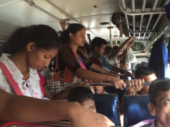 Auch in Dambulla fahren die Busse im 5-10 Minuten Takt ins ca. 65km entfernte Kandy, aber nirgendwo sind Sitzplätze frei. Der in Aussicht gestellte AC-Bus kommt dann nach ca. 30 Minuten Warten und soll wesentlich schneller sein, da er nicht alle paar Minuten in jedem Dorf hält. Wir beziehen die letzten Plätze im Gang und in der Front direkt neben dem Fahrer und hochgestapelten Gepäck. Hier bekommt man die chaotische und waghalsige Fahrweise doch gleich noch viel besser mit!!!