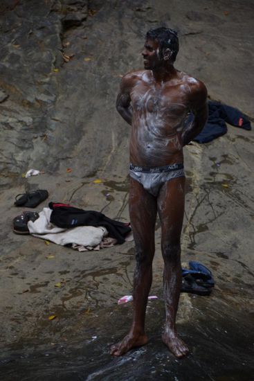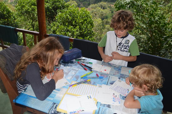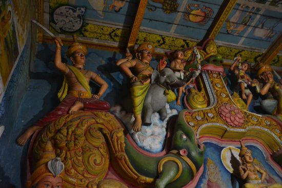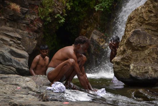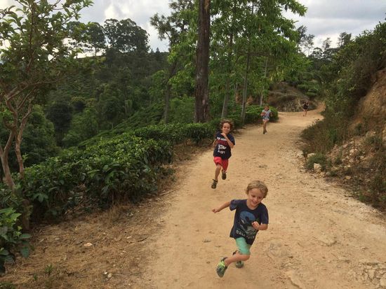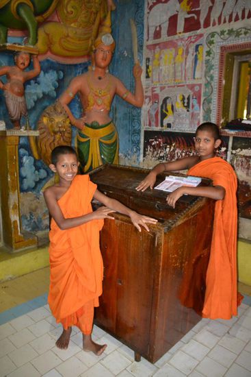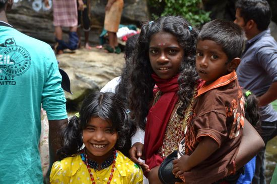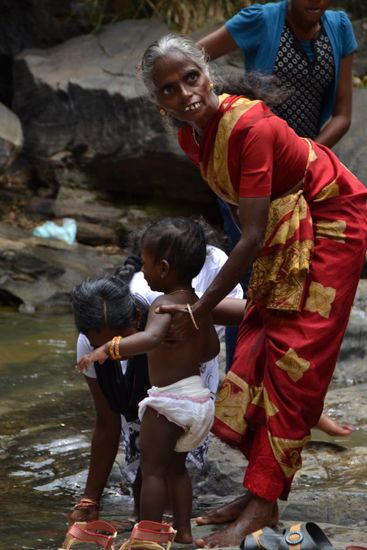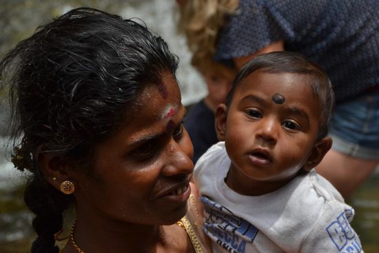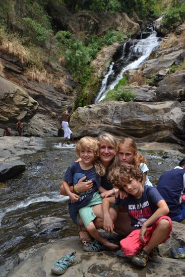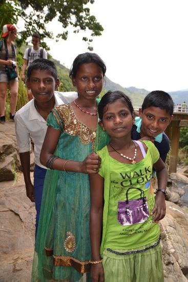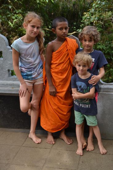 Am nächsten Morgen leckeres Frühstück mit frischem Obst auf der Veranda, sehr schönes Ambiente mit Hängematte und Ausblick. Der freundliche und zurückhaltende Manager erfüllt quasi jeden Wunsch und gibt uns ein paar Tipps für den Tag. Mit dem von ihm organisierten Tuk Tuk geht es kurz vor Mittag zu den Rawana Falls, ein sagenumwobener Hindu-Ort. Hier schnappen sie uns mal wieder Matteo und Nevio weg, dafür beobachten wir die vielen Badenden und knipsen zurück... Später geht es zu einem stillen Höhlentempel unterhalb der Straße nach Bandarawela, idyllisch an einem Bach gelegen. Hier treffen wir auf zwei Jungmönche und kommen etwas ins Gespräch. Übrigens haben wir uns nun endlich daran gewöhnt, dass 'Kopfwackeln' hier nicht 'Nein', sondern 'Ja' bedeutet. Es wird aber nicht wie bei uns zum 'Nein' gewackelt, also links/rechts um die vertikale Achse, sondern um eine horizontale Achse, so als wöllte man mit den Ohrläppchen abwechselnd die linke und rechte Schulter berühren. Das ist nach wie vor sehr lustig, z.B. wenn man Preise verhandelt - der Einheimische schüttelt bei Einigung mit dem Kopf... man ist kurz verwirrt... bis man dann das 'Okay' schnallt. So und nun stelle ich mir genüßlich vor, wie ihr das versucht nachzustellen... ;o) Am Nachmittag lassen wir uns etwas außerhalb von Ella am Wanderweg zum Little Adams Peak absetzen. Durch Teeplantagen geht es an einem Dorf vorbei in 35 Minuten hinauf. Oben sehr schöner Weitblick Richtung Tiefland und Meer sowie hinüber zum Ella Rock. Wir bleiben einfach etwas sitzen und genießen... Gegen Abend laufen wir zurück nach Ella, es gibt wie versprochen Eis und Shakes. Obwohl hier schicke Restaurants sind, haben wir bereits im Quartier das Abendessen zugesagt. Rice & Curry aus hauseigener Küche - wir werden es nicht bereuen! Danach Relaxen und kühle Getränke auf unserem Balkon bei gedämpftem Licht.
