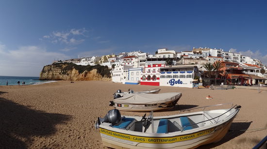 Noch ein paar km weiter östlich, erreicht man den ebenfalls früher kleinen Ort Carvoeiro. Recht malerisch gelegen, direkt an einer kleinen Badebucht, eingerahmt von an den Hängen gebauten Häusern. Dort haben wir uns erst einmal einen Cappuccino schmecken lassen, die Aussicht genossen und eine Weile in der Sonne gesessen, bevor wir dann weiter bis an die Badebucht Vale de Centeanes gefahren sind, um dort noch ein paar Fotos zu machen. Nun war es schon Nachmittag, und wir sind gemütlich zurück in unser Apartment. Dort gab es dann später gebratenen Lachs mit Salat und Curryreis.......