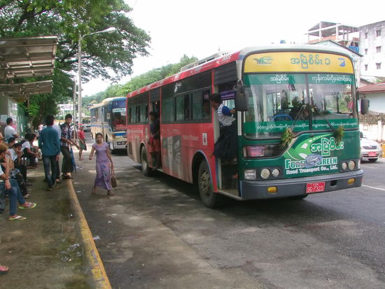 Der Bus ist eine gute Transportmöglichkeit. Es kostet 100 bis 200 Kyat. Man ruft dem Türsteher den Ort zu, wo man hinmöchte und er nickt oder winkt ab. In den Hostels liegen auch Stadtpläne aus, mit denen man sich gut orientieren kann. Taxis sind auch sehr preiswert. Für 2 bis 3000 Kyat kann man durch die halbe Stadt fahren.