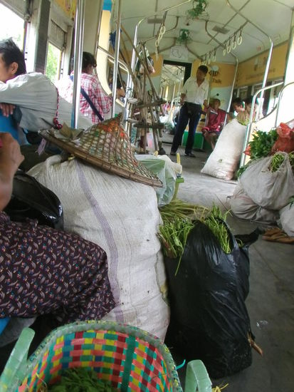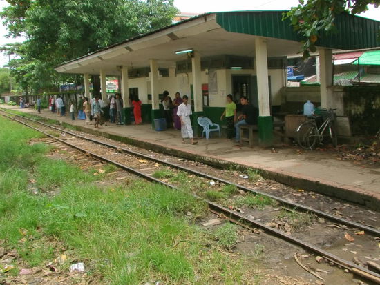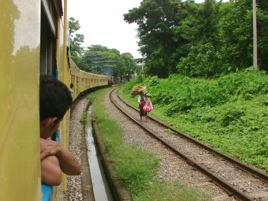 Man kann einmal mit dem Zug rings um Rangon herum fahren. Die Fahrt dauert ca. drei Stunden, das Tempo ist sehr gemütlich und es kostet 200 Kyat.