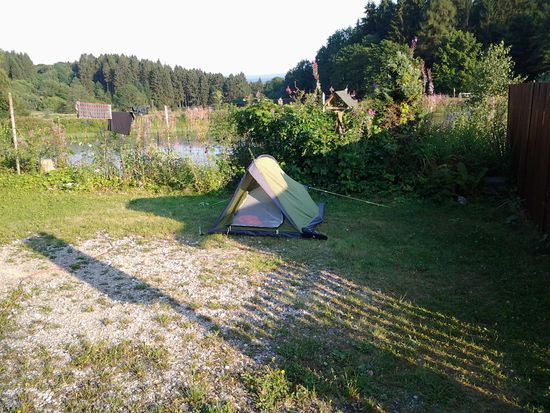 nach müsste es ja nochmals hinuntergehen. Aber nicht's da, es steigt weiter munteran und stehe urplötzlich vor dem Campingplatz. Der liegt also oben. Noch einen halben Kilometer bis zum Eigang und es ist tatsächlich 15:00 Uhr. VIiel Platz gibt es hier, an einem kleinen See gelegen, allerdings nicht zum Baden geeignet.