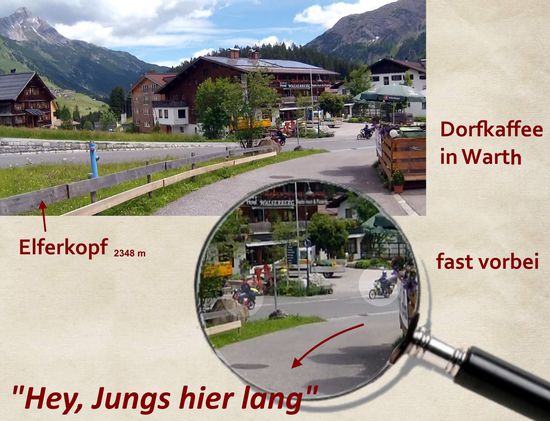 Nachdem der Holländer zum Souvenir-Kaufen in Warth anhielt, konnten Wene und Stoney aufholen. Da ich schon außer Sicht war gaben sie Vollgaß und verpassten fast die Abzweigung.