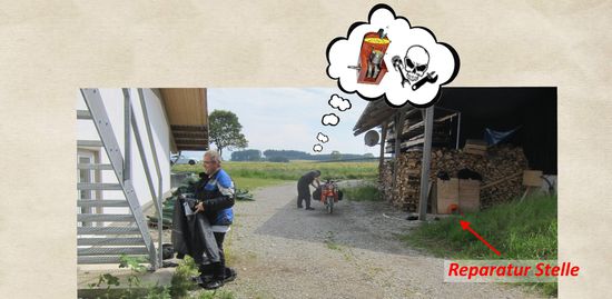 Wir hielten an einem Bauernhof an, stellten uns unter und die Drecks Fehlersuche ging erneut los.
