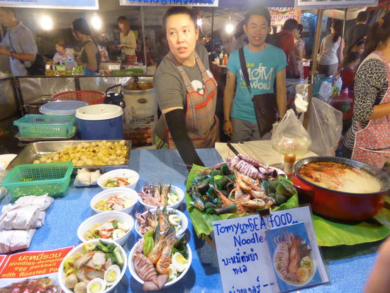 Der Nachtmarkt hat sich im Vergleich zu damals leider zum Negativen verändert. Zum einen ist es brechend voll und es ist wesentlich touristischer geworden. Damals tummelten sich hier hauptsächlich Thais, die mit ihren Familien über den Markt mit seinen bunt gemischten Buden schlenderten. Inzwischen müssen sich die Imbissbuden alle auf einem Foodcourt befinden, denn auf der Hauptstraße ist essen und trinken verboten, und sie sind bei weitem nicht mehr so vielfältig. Auf dem Foodcourt drücken wir den Kindern Geld in die Hand, denn sie wollen ihn für sich allein erkunden. Wir anderen teilen uns auch paarweise auf, denn bei dem Gedränge ist es sowieso schwer, als Gruppe beisammen zu bleiben. So futtern wir uns durch die Buden und es ist auch alles sehr lecker, bis auf die glibbrigen Hühnerfüße, die sich Rene bestellt. Und dabei hatte er sich noch gewundert, warum der Imbissbesitzer so hämisch grinst und kichert, als er ihm das Essen zubereitet. Haha, das kann mir nicht passieren.